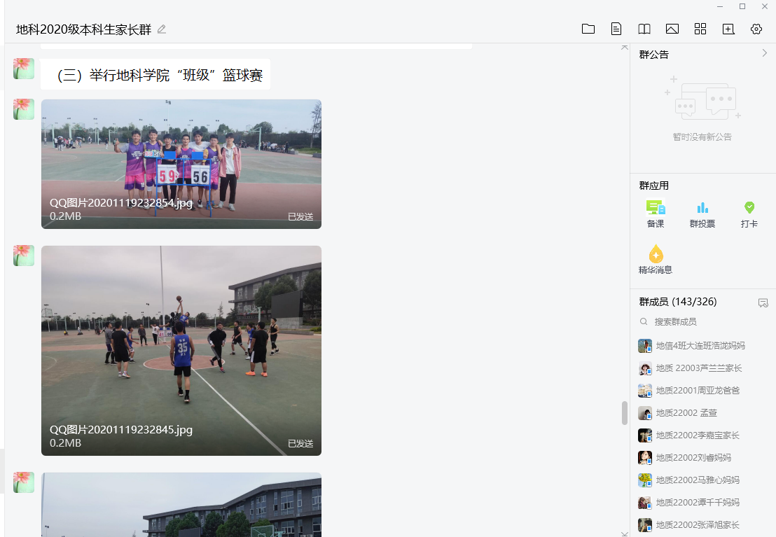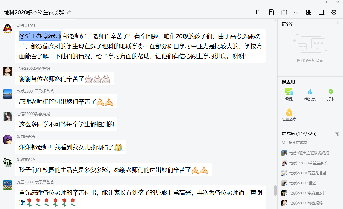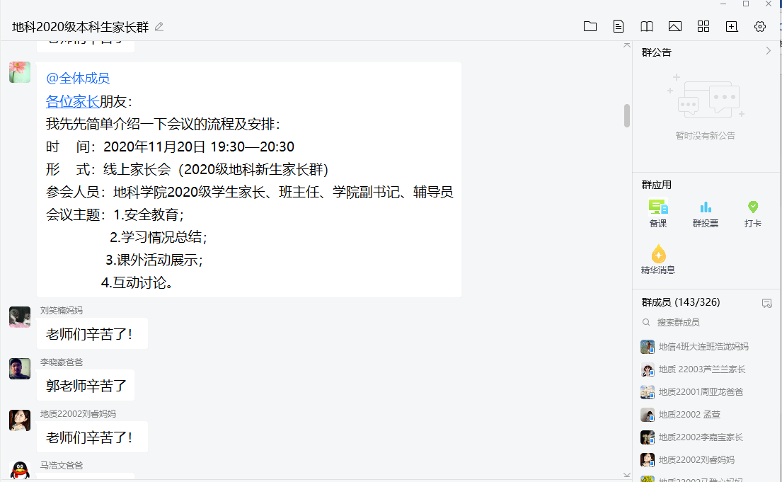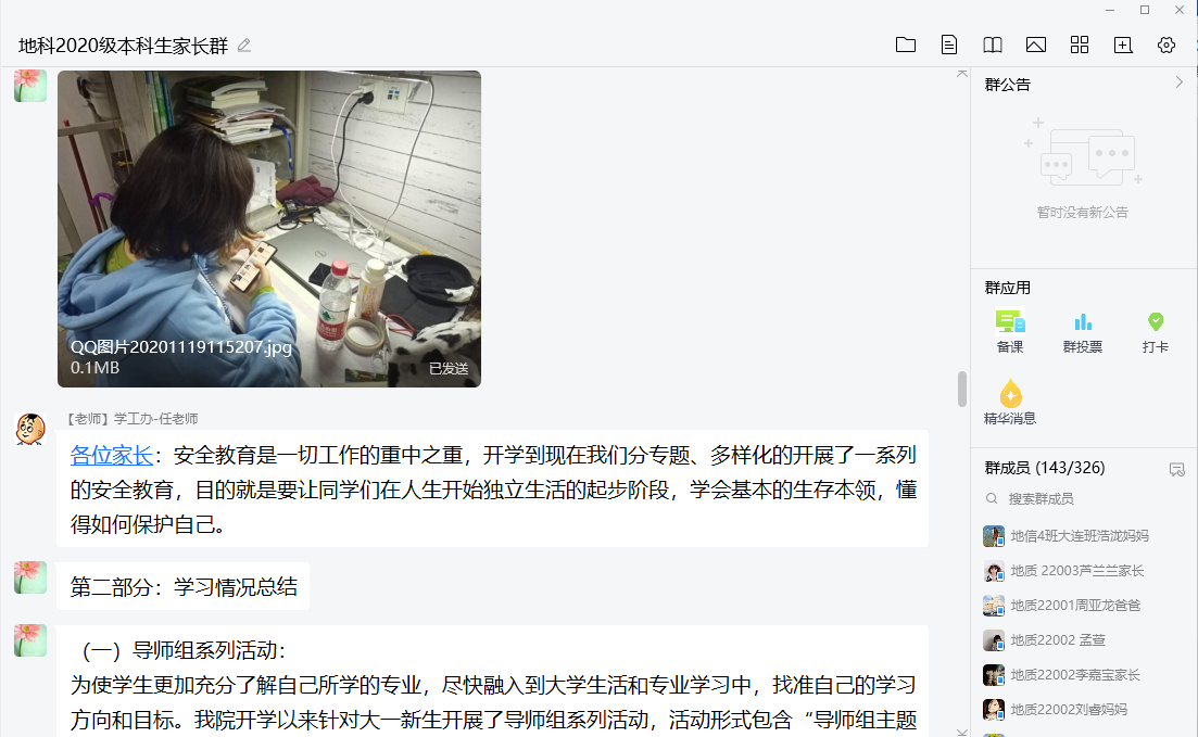 (通讯员:郭霖)11月20日晚7点半,2020级本科生家长群热闹非凡,学工办全体老师与家长们齐聚一堂,召开了20级本科生第一次线上家长会。本次家长会由学院党委副书记任倩老师主持,20级辅导员郭霖老师以“文字+图片”的形式,主要从安全教育、学习情况总结、课外活动三个方面向家长们展示了同学们在校期间的学习与生活。