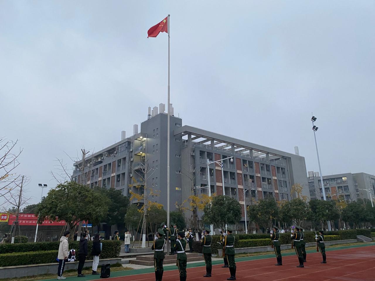 7点整,主持人地信22002班的杜淑仪同学宣布升旗仪式正式开始。在全体师生的注目下,英姿飒爽的国旗护卫队队员们护送鲜艳的五星红旗进场,伴随着庄严的中华人民共和国国歌响起,五星红旗冉冉升起,迎风飘扬。全体人员向国旗行注目礼,深怀对祖国无限的热爱和崇高的敬意。