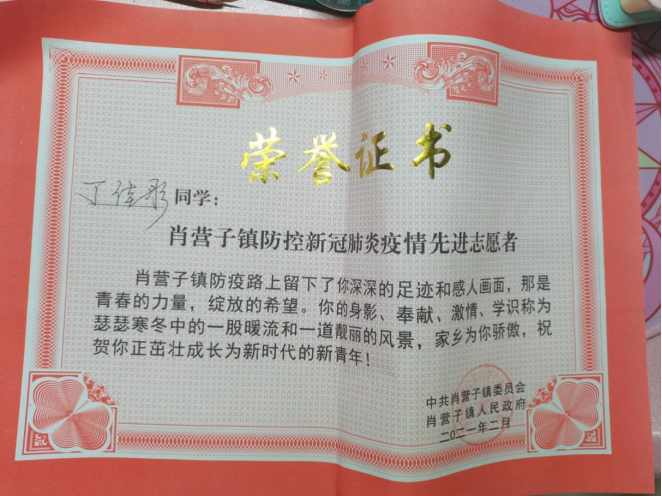 大年初二,刚与家人吃完年饭,她又投身村头检查站的日常排查,每天值守,询问经过的每一辆外地车辆的行程并做登记。天寒地冻,为了更快速的记录,保证道路通畅,她没有选择戴手套,为此虽然受了冻,但看到疫情消散,家乡平安无事时,她觉得每一份辛苦都很值得。因为出色的表现,丁佳彤被授予“肖营子镇防控新冠肺炎疫情先进志愿者”。