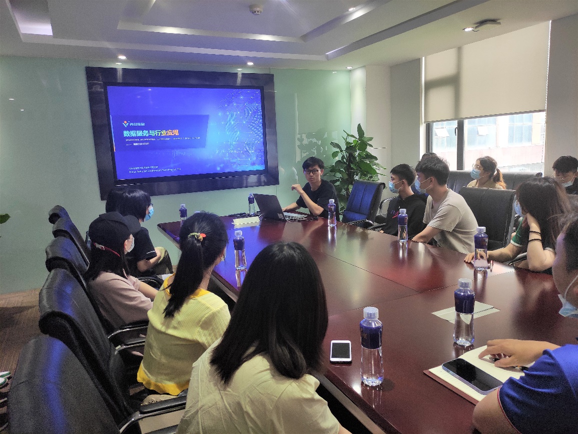 关于公司的产品,开发主管也向同学们进行了介绍。展示了公司研发的产品在交通、金融、智慧城市等方面进行了广泛的应用。一个个界面友好、功能强大、使用方便的产品,让同学们叹为观止。同学们也对其中感兴趣的部分进行了提问,开发主管都很耐心地进行了回答。