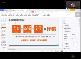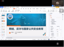 艺传学院肖淳老师就网络、反诈与国家公共安全教育这一主题进行分享。肖老师讲到武汉校区今年已经发生22起诈骗案件,其中有不少是同学们在之前的专题讲座中听过的“常见的诈骗手段”。她提到当一个人放松警惕时,就给了骗子可乘之机,提醒大家务必高度重视、认真完成每周反诈测试,保护个人财产安全。