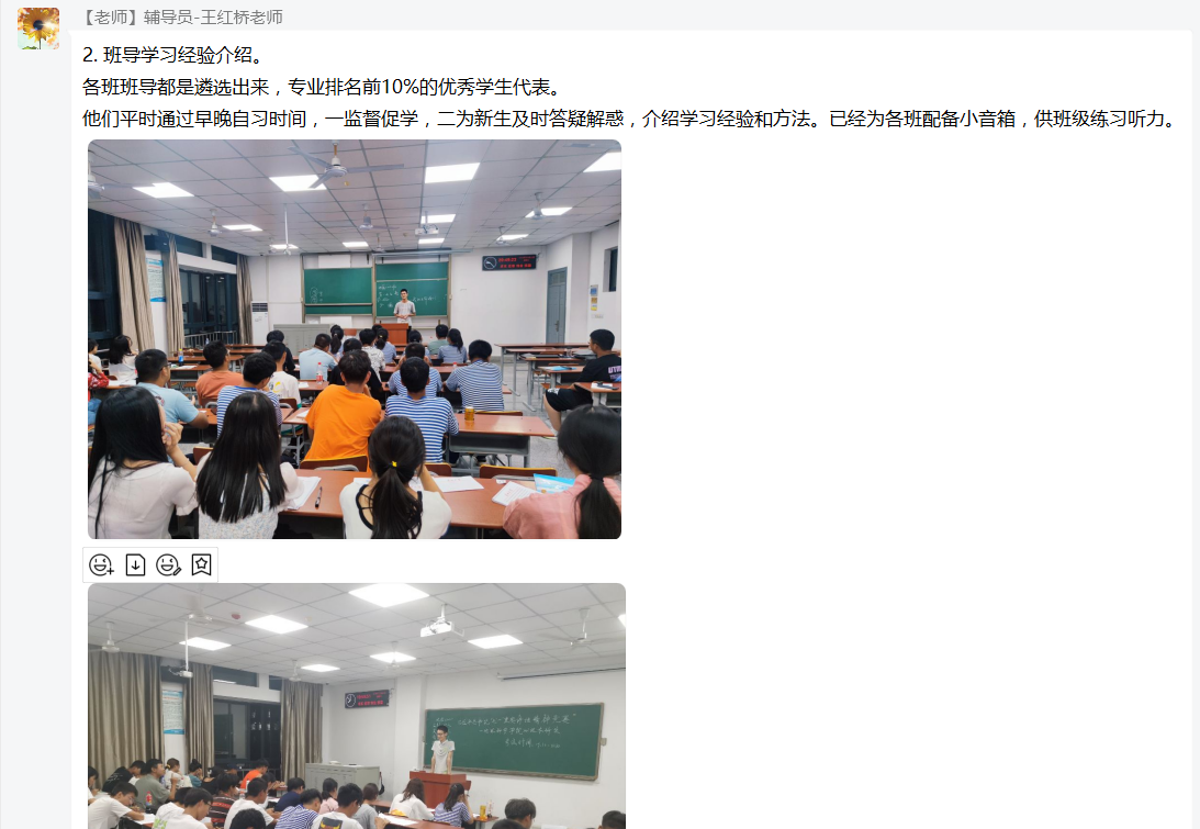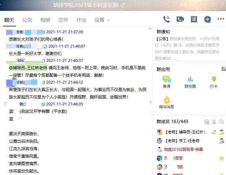 “3+1”升级版导师组、“我与导师面对面”等增进新生专业认知、激发学生学习兴趣的特色举措,以及新生班导在早晚自习伴学答疑,分享学习经验的考勤、活动照片,让家长直观的了解同学们日常状态,临近期末,她提醒家长共同督促学生以良好状态准备期末考试。