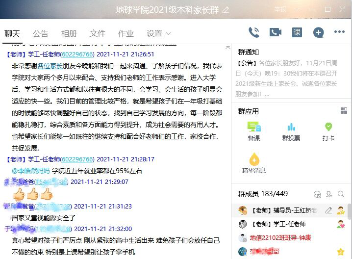 通过QQ群召开新生线上家长会。学院党委副书记任倩以及年级辅导员王红桥、300余名学生家长参会。