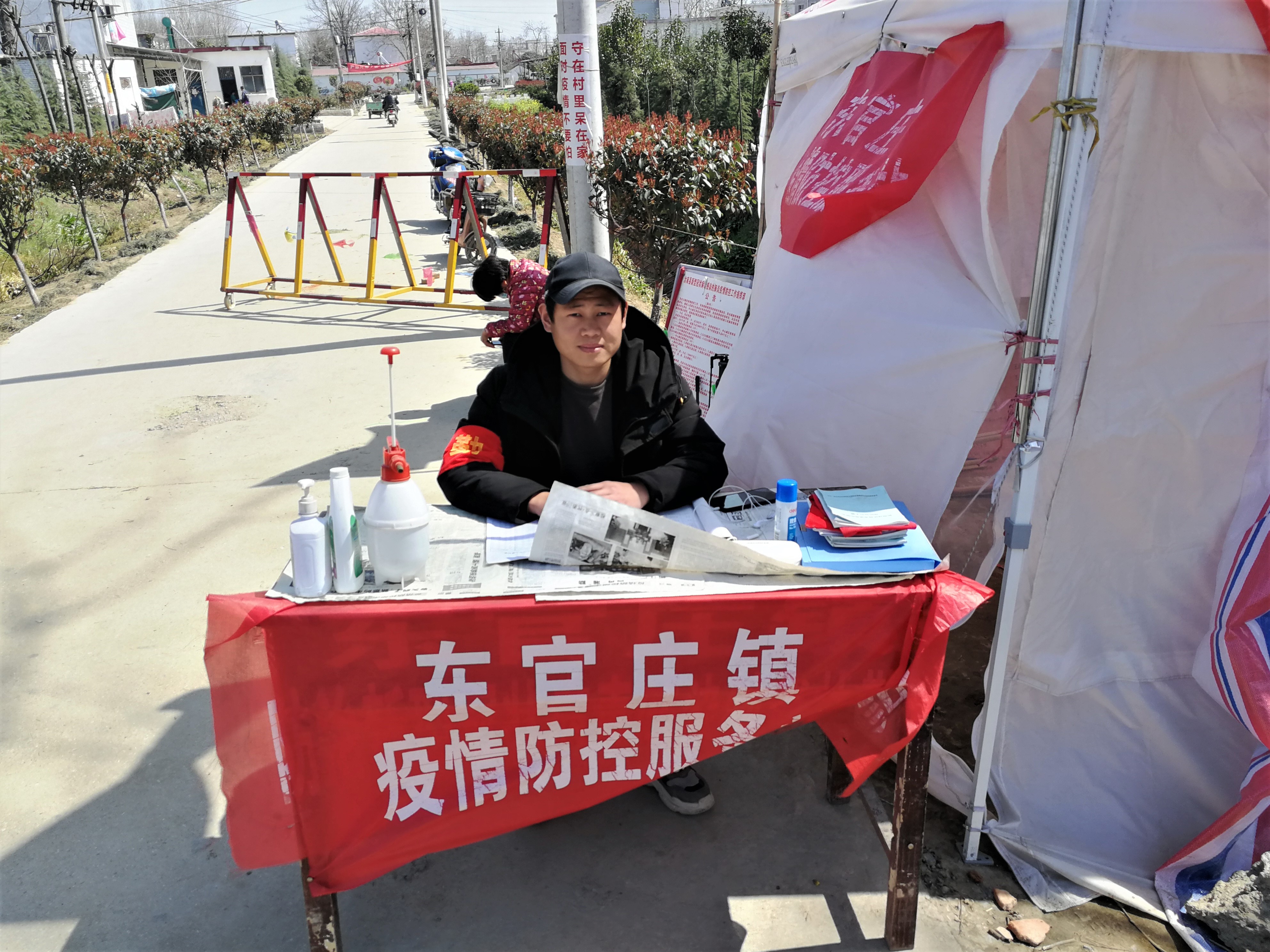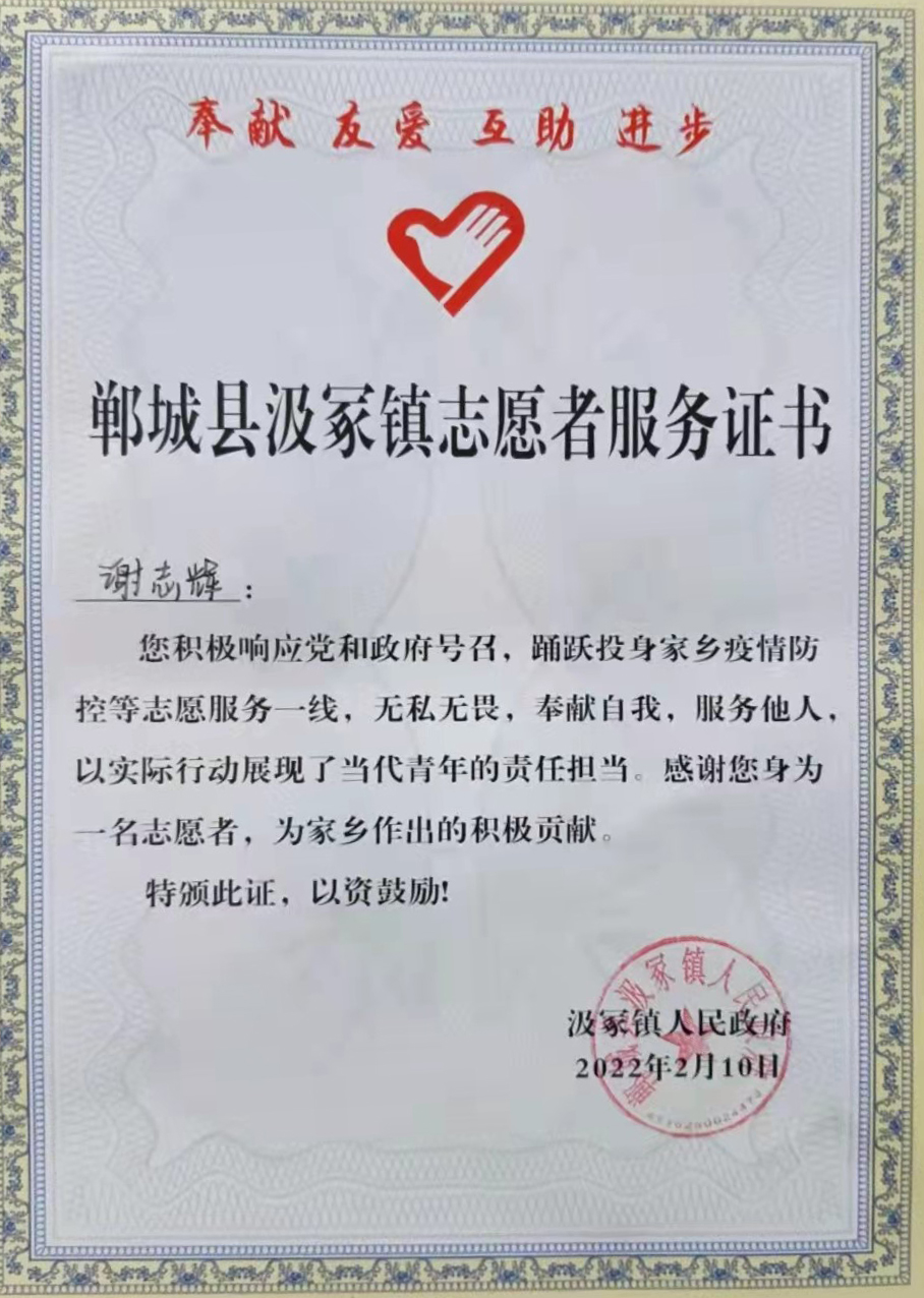 资环QZ201赵春晖在去年寒假时就曾参与到了抗疫志愿者的工作中,今年也不例外。刚刚过完春节,山东的天气还是非常寒冷,但是他还依旧坚守在防疫的值班岗上。核查外来返乡人员和登记他们的信息是他每天的日常工作。遇到口罩戴得不规范的爷爷奶奶,他一边科普防疫基本知识,一边演示如何正确佩戴口罩,提醒着:“爷爷奶奶,平时一定要注意戴好口罩啊。”他觉得,虽然大家在热热闹闹过年,但是防疫也一刻不能松懈。他觉得每个人都献出自己的一份力量,众志成城,一定能打赢这场防疫保卫战。因为出色表现,他被村委会授予了“先进防疫志愿者”称号。