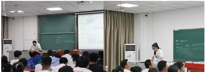 接着是“防疫安全”,临近国庆,辅导员强调疫情防控不能放松,全体学生非必要不出校门,出校门要书面请假,对新到校学生,必须在宿舍“居家观察”并坚持“7天5检”。第三部分是“防溺水”,因为校区靠近水源,辅导员讲解了四个溺水案例,希望大家引以为戒,务必做好安全防护。