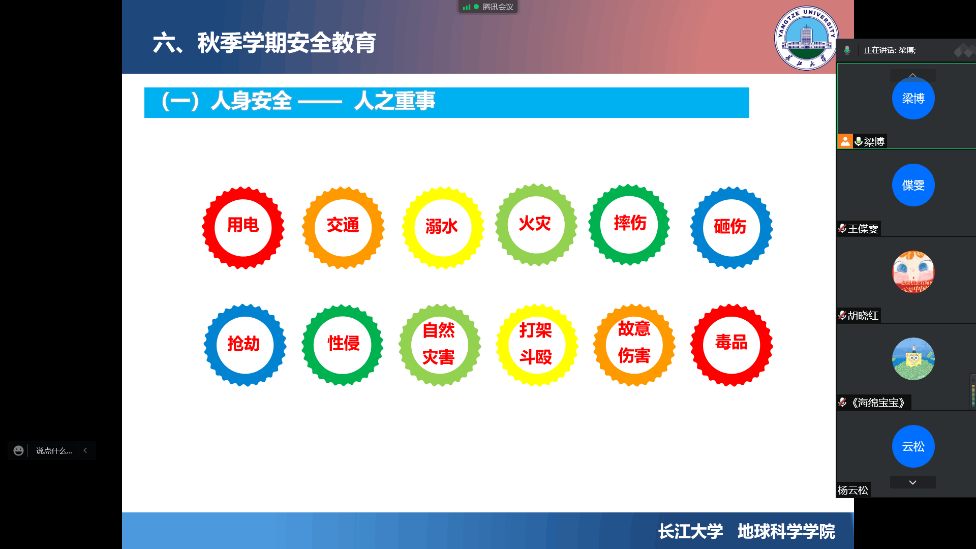 会上,辅导员传达了学校关于国庆节期间安全管理规定,讲解了当前学校疫情防控政策,要求同学们积极配合疫情防控工作,坚决落实学生个人疫情防控主体责任。而后,还通过安全知识讲解和案例分析对学生进行安全教育,强化学生在人身安全、消防安全、防电诈安全、防溺水安全等方面的意识,提升学生安全处置能力。