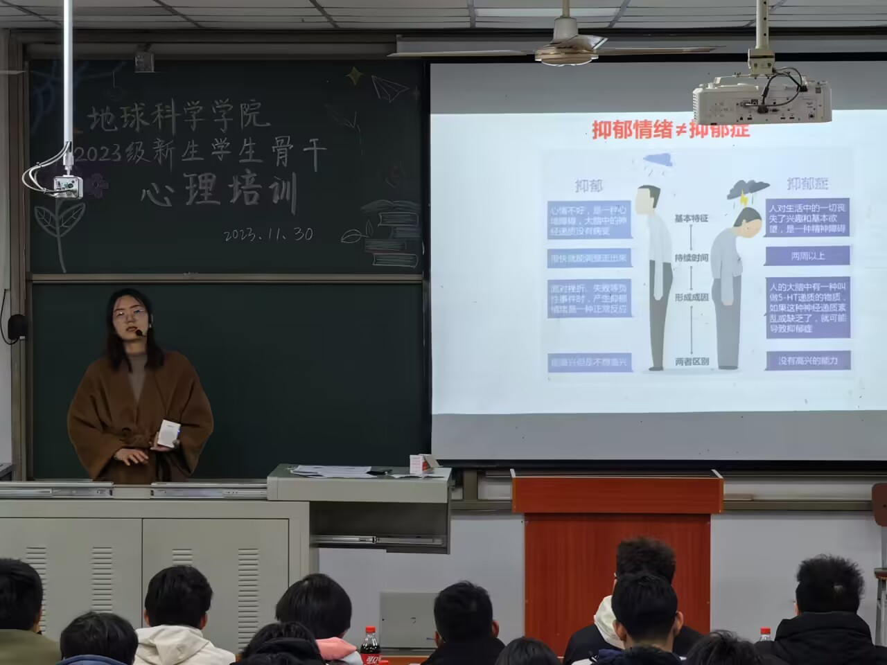 培训伊始,王老师通过现场抢答的方式与同学们互动。“我校心理中心生命热线”、“辅导员手机号码”等问题,提醒同学们在发现紧急情况时能有效求助。