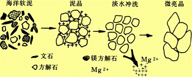 海洋软泥受淡水冲洗,解除了“镁套”的束缚,重结晶为微亮晶方解石的过程