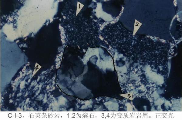 、通过对CI20(岩屑杂砂岩)、CI3(石英杂砂岩)的手标本和岩石薄片的一般观察,了解杂砂岩的主要特征。
