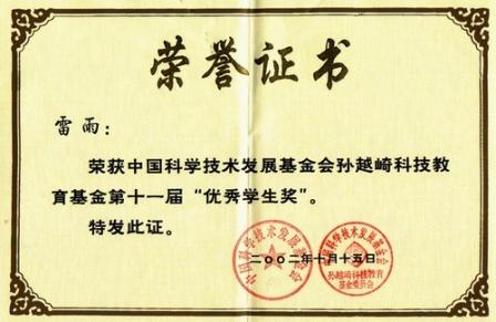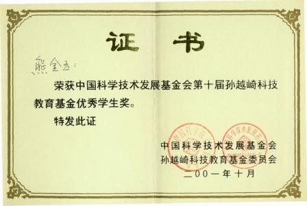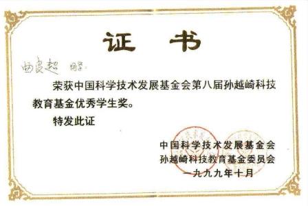 学生获得孙越崎科技教育基金会"优秀学生奖" 证书