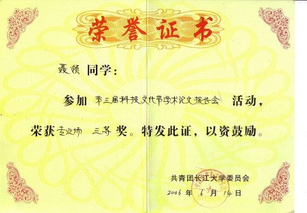 资工031班聂领同学撰写的科技论文在2006年大学生科技报告会上获三等奖证书
