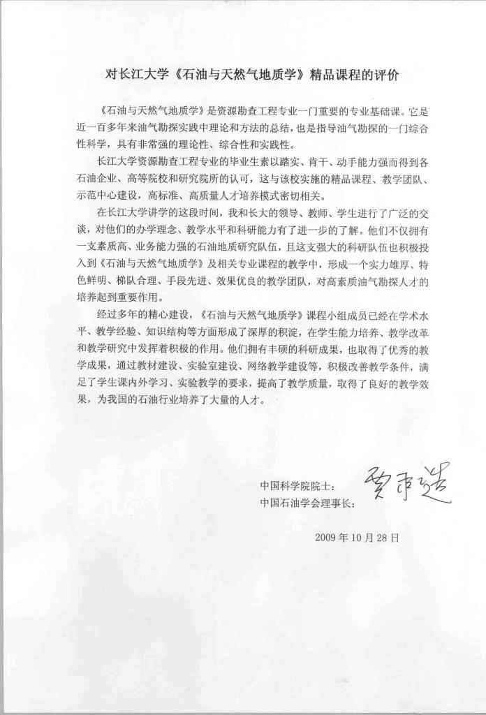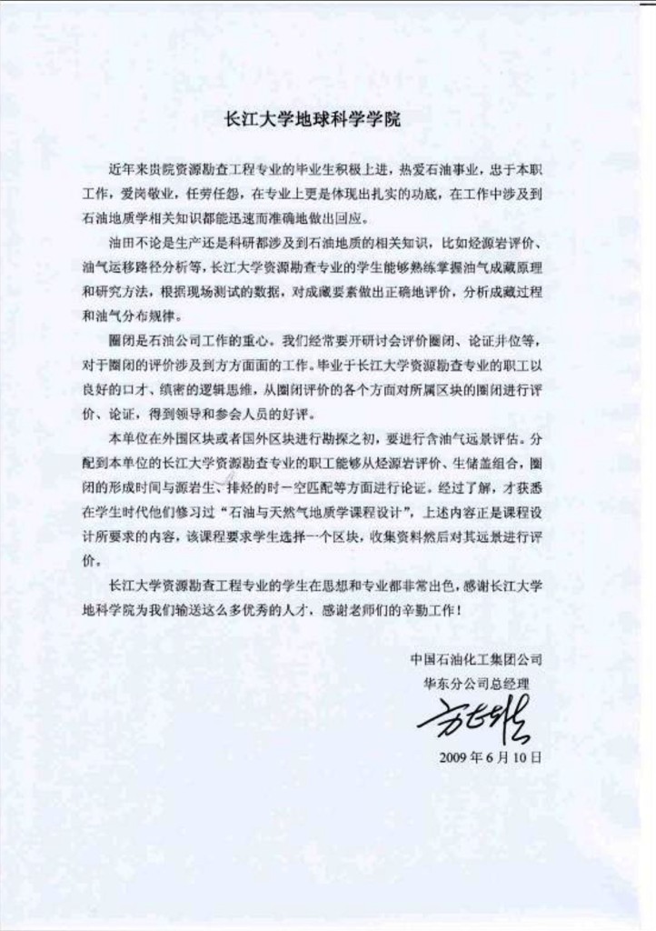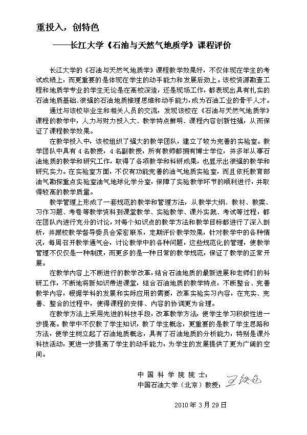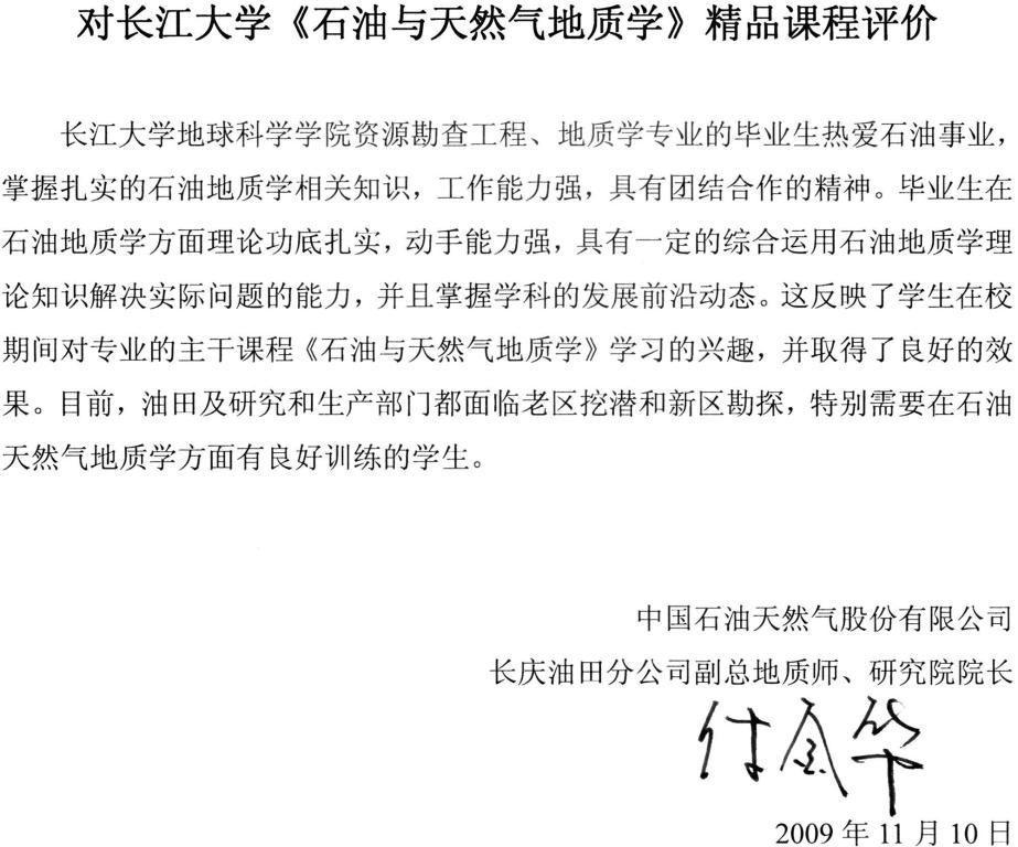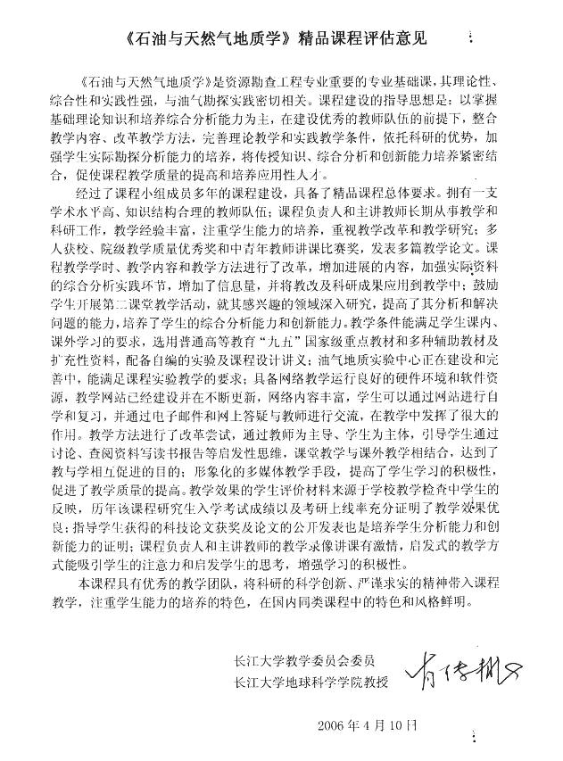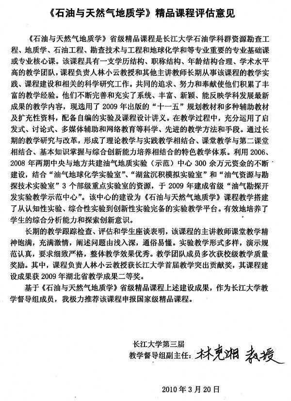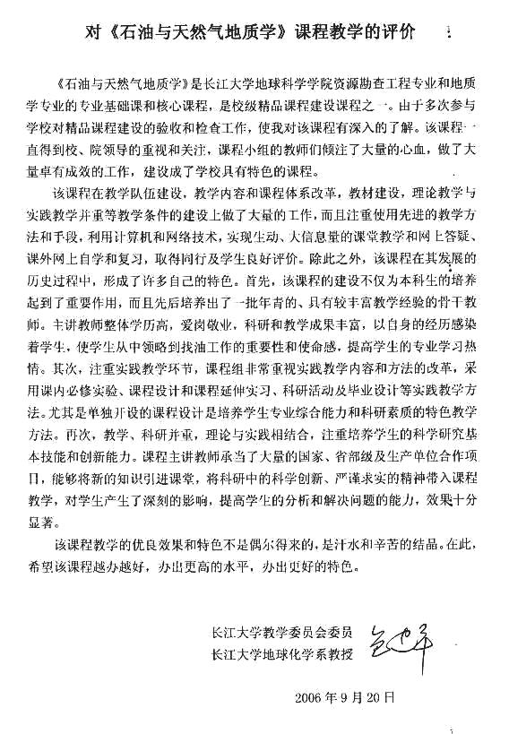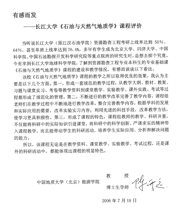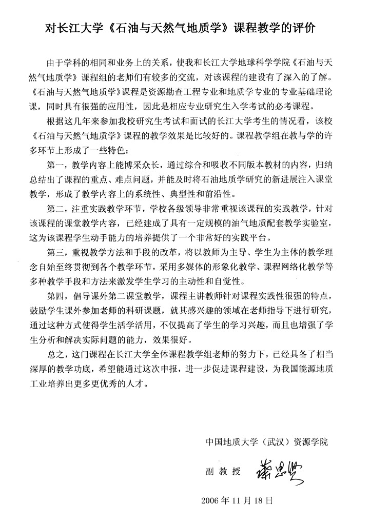 资源勘查工程专业较高的考研上线率和专业课的成绩反映,该校《石油与天然气地质学》课程的教学取得良好的效果。我为该校《石油与天然气地质学》课程有这样的成绩高兴,这是领导、老师们辛勤劳动的结晶,也是我们国家石油事业的骄傲。