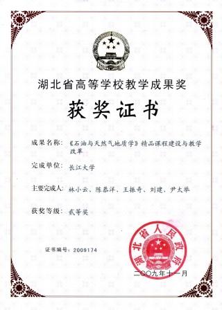 教学成果一等奖(证书编号:2008019)、2009年湖北省教学成果二等奖(证书编号:2009174)。