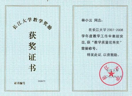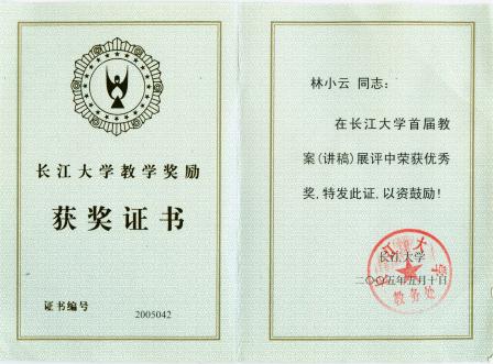 教学成果特等奖(排名4)(证书编号:2008002)、2009年湖北省教学成果一等奖(排名4)(证书编号:2009076)。